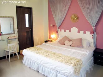 | 寶藍色夜空,許許多多星星們努力的展示著自己,好像也想加入您們熱鬧的談話之中呢!大大的懶骨頭和雲朵桌,就是要讓您們在星空城堡裡,渡過歡樂又舒適的夜晚。睡覺前記得把燈全部關上,細耳傾聽,星星們的悄悄話哦! | ||