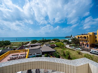 在海景房裡,敞開落地窗,可以看到古厝、長堤、沙灘與大海相映成趣,海灘遊人與朵朵浪花點綴其中。閉上眼,浪濤聲輕輕傳來,伴著陣陣海風吹拂,讓人置身於萬種南島風情之中。