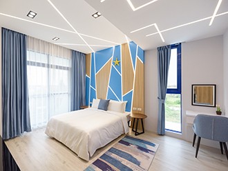 在海景房裡,敞開落地窗,可以看到古厝、長堤、沙灘與大海相映成趣,海灘遊人與朵朵浪花點綴其中。閉上眼,浪濤聲輕輕傳來,伴著陣陣海風吹拂,讓人置身於萬種南島風情之中。