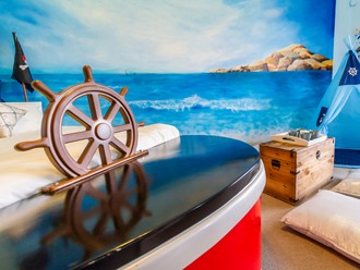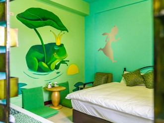 輔以世界經典格林童話故事;以《愛麗絲夢遊仙境》、《白雪公主》、《美女與野獸》、《睡美人》、《糖果屋》等為各房型佈置主題,猶如置身於兒時耳熟能詳的夢幻故事裡,且大部分房型皆具面海景致與獨立陽台,恣意享受海洋渡假風情!